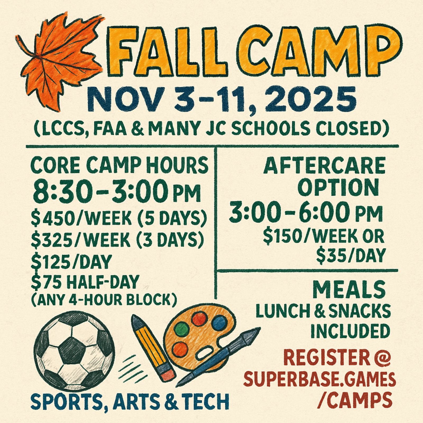 Core Camp + Aftercare option from 8:30am - 6:30pm Friday (Nov 7).